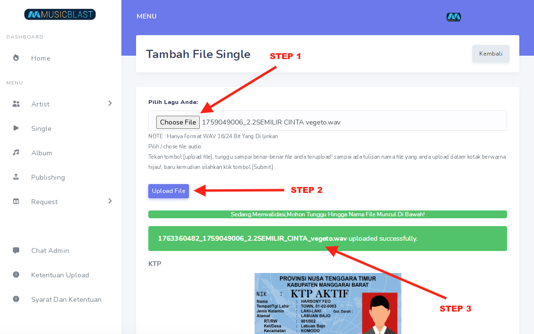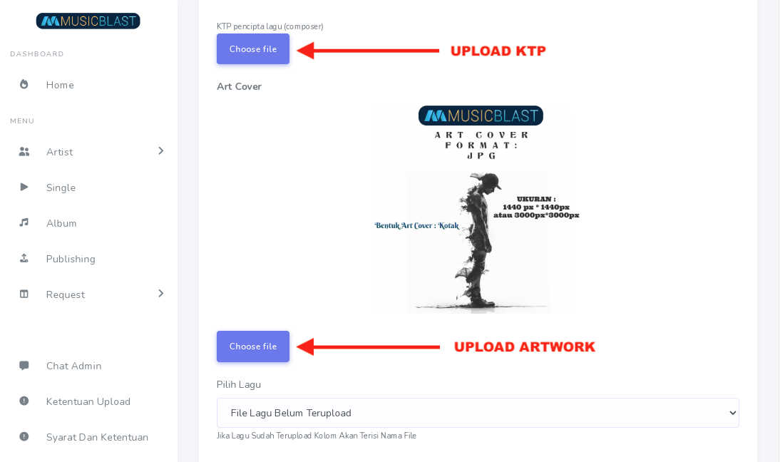➔ Kemudian masih di halaman yang sama, lanjutkan dengan mengupload KTP dan Artwork, pastikan format artwork sesuai dengan format yang ditentukan oleh Musicblast (Tertera di contoh untuk size dan dimensinya)