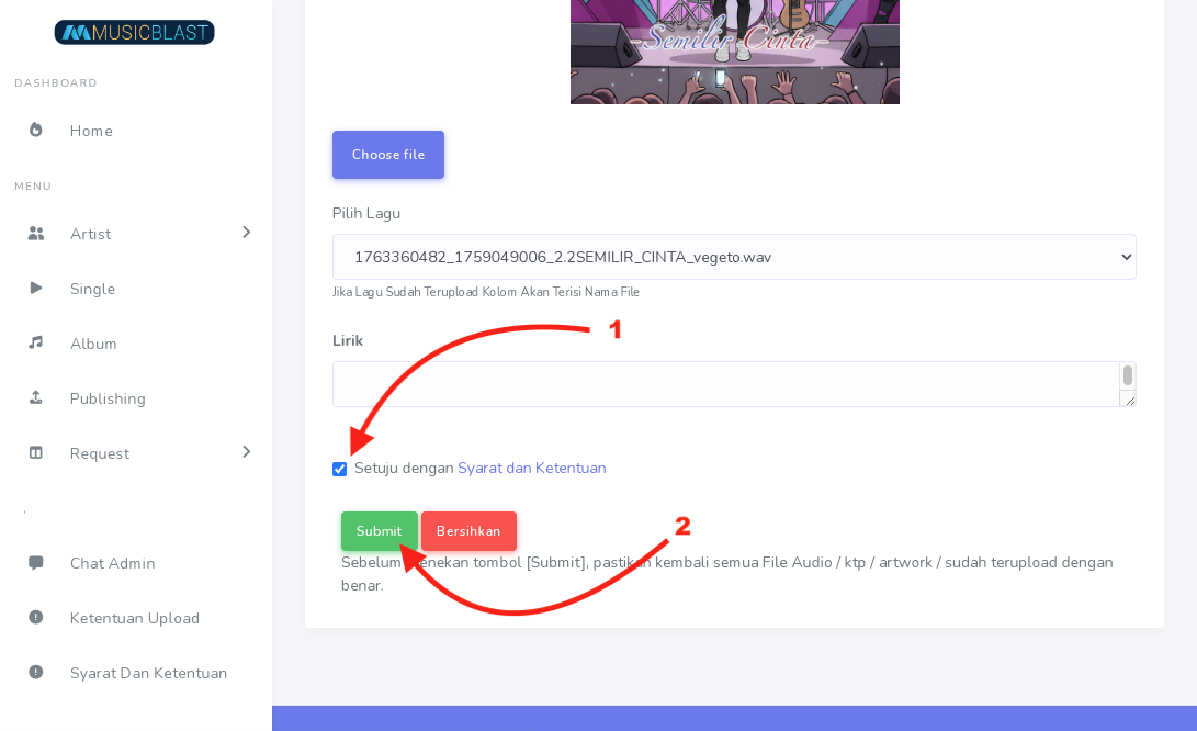 ➔ Setelah semua file audio / ktp / artwork benar terupload di halaman yang sama, paling bawah halaman lanjutkan dengan :