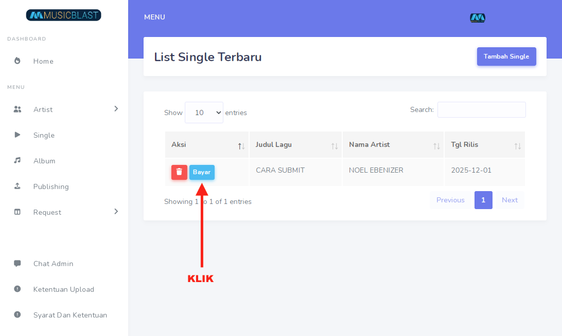 ➔ Setelah file audio / ktp / artwork sudah terupload dan tersimpan anda otomatis akan berada di halaman List Single Terbaru, Klik ‘Bayar’. kemudian anda akan masuk ke halaman Pembayaran