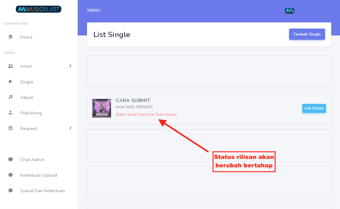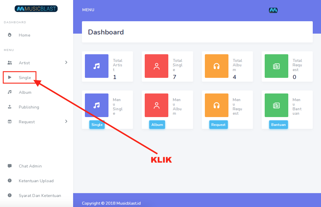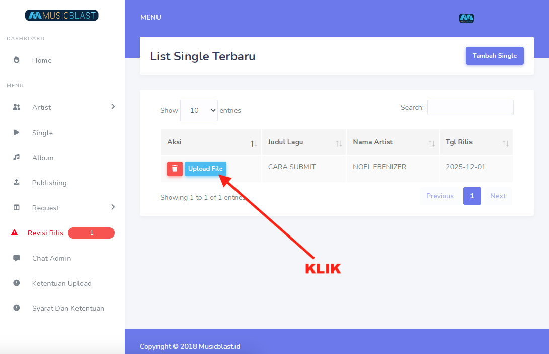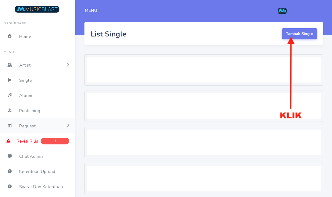 ➔ Setelah itu anda akan masuk ke halaman List single. Klik tambah single di kanan atas dashboard
