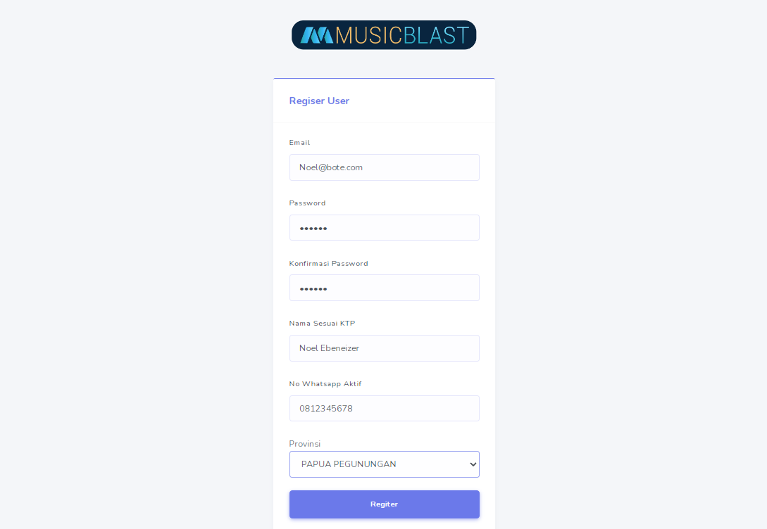 ➔ Isi form sesuai yang diminta, kemudian klik [register] (pastikan email yang anda masukkan benar, aktif dan email inbox tidak penuh). Setelah berhasil akan ada notifikasi masih di halaman yang sama untuk mengecek inbox email anda, pergi ke email anda dan tekan aktifkan di email musicblast yang terkirim. Setelah itu anda sudah berhasil terdaftar sebagai user musicblast.id dan bisa langsung mensubmit karya-karya original anda.