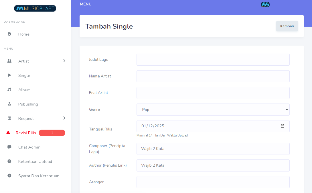 ➔ Setelah masuk ke halaman Tambah Single, silahkan isi Form Metadata dengan baik dan benar. Pastikan mengikuti keterangan yang ada dalam Form, seperti penulisan Composer / Authors yang harus nama lengkap (minimal dua kata) dll agar mempermudah proses perilisan dan rilis sesuai jadwal yang ditentukan. Kemudian paling bawah halam klik ‘Simpan’